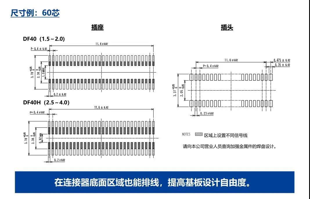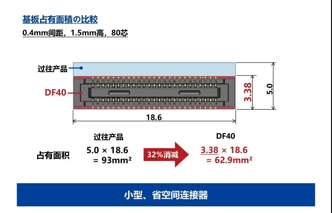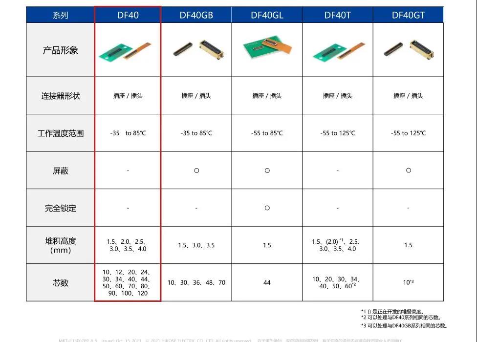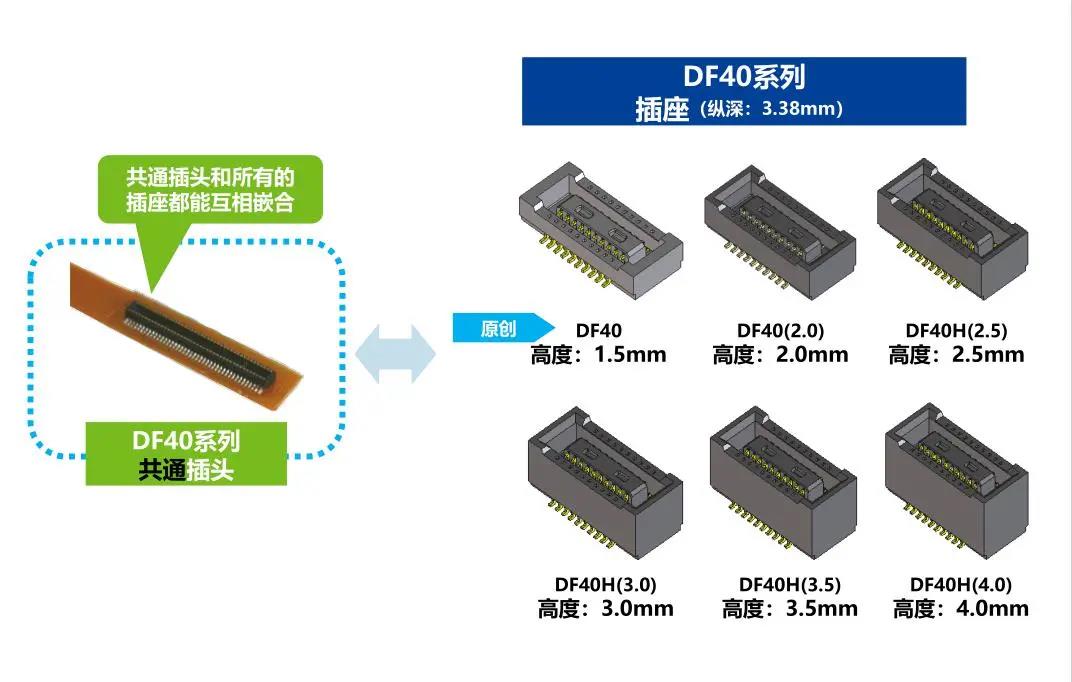 特點(diǎn) 1. 省空間:縱深3.38mm 2. 堆疊高度 1.5-4.0mm 3. 對(duì)應(yīng)USB4 Gen.2(10Gbps)信號(hào)傳輸 *1 4. 有效嵌合長(zhǎng)度長(zhǎng):0.45mm 5. 卓越的端子構(gòu)造實(shí)現(xiàn)了明確的鎖扣手感以及大嵌合力 6. 防止端子變形構(gòu)造 7. 種類繁多(帶護(hù)罩:DF40G系列,帶完全鎖:DF40GL系列,ADAS:DF40T系列) 8.核心數(shù)量從10到120核心變化巨大 9.用導(dǎo)向肋確保自動(dòng)對(duì)準(zhǔn):0.33mm 10.防止鎳阻擋層焊接的結(jié)構(gòu) 11.還提供用于生產(chǎn)線檢查的高度耐用的連接器* 只有H=1.5 mm的產(chǎn)品支持Type-C DF40系列變體