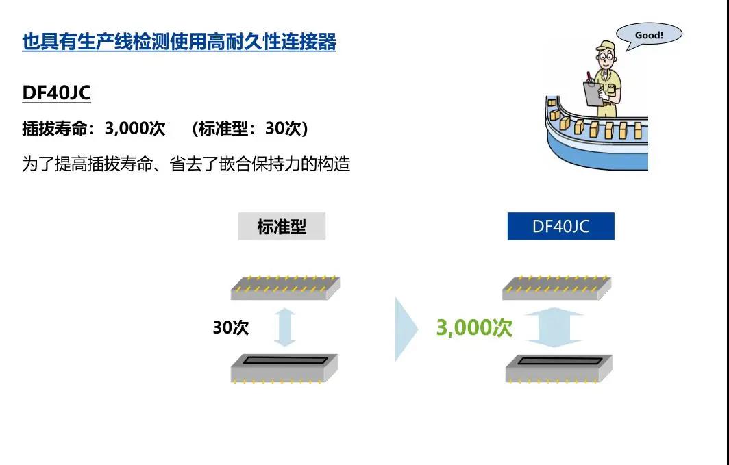 7. 種類繁多(帶護(hù)罩:DF40G系列,帶完全鎖:DF40GL系列,ADAS:DF40T系列) 8.核心數(shù)量從10到120核心變化巨大 9.用導(dǎo)向肋確保自動(dòng)對(duì)準(zhǔn):0.33mm 10.防止鎳阻擋層焊接的結(jié)構(gòu) 11.還提供用于生產(chǎn)線檢查的高度耐用的連接器* 只有H=1.5 mm的產(chǎn)品支持Type-C