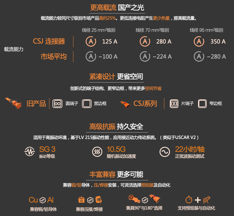 針對不同細分需求,CSJ系列分為CSJ1200、CSJ1800與CSJ2100三款高壓連接器,分別對應Class3、Class4、Class5級別的載流級別需求。三款產品在不同應用領域各擅勝場: